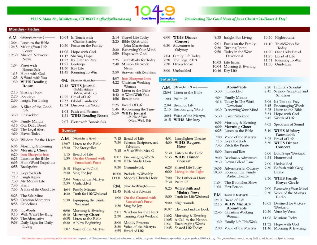 WIHS’ popular Good News e-newsletter is now distributed WEEKLY on Saturday mornings. Why? To give you the heads-up on what local WIHS-produced shows will air in the week ahead, with plenty of helpful hotlinks. It’s all part of our ongoing initiative to increase our digital footprint as we gradually morph from a radio station to a multi-media ministry! Click here to subscribe.